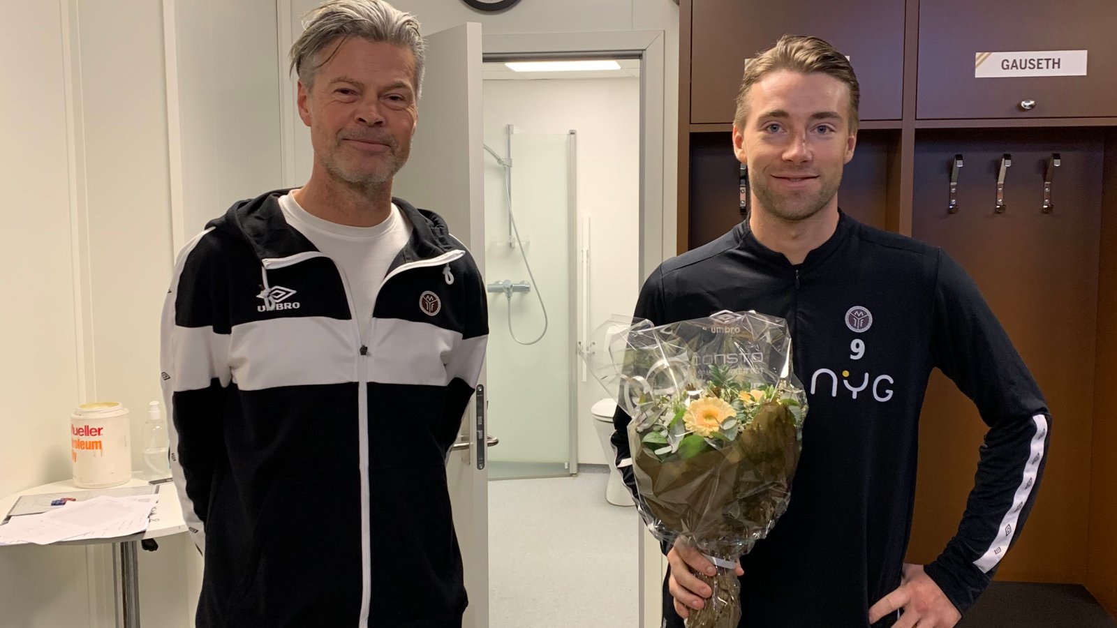 På bildet over har Sondre fått overrakt blomster av hovedtrener Vegard Hansen.