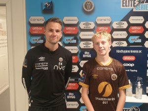 Dagen etter at han ble konfirmert, debuterte Sondre Granaas på seniornivå for Mjøndalen og gratuleres av toppspillerutvikler Eirik Sande Kristoffersen.